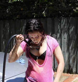 7:48 minute video in color. 3 downloads link expires in 30 days. Reina from Brazil appears in the great color video of her washing the car in her blue jeans and pink top. After she is done washing the car, she goes into the back yard and gets into the swimming pool in her pink top and blue jeans.